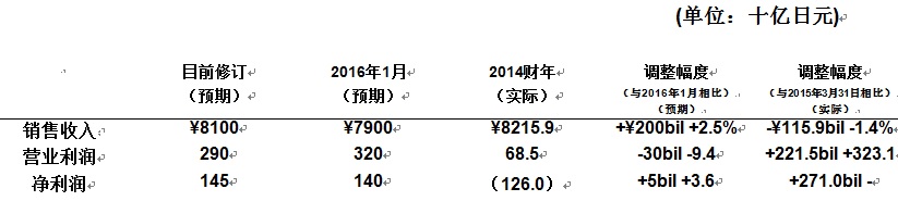 *2016年1月29日发布的业绩预期数字,汇率按照2015财年第四财季(2016年1月1日至2016年3月31日)预期汇率约1美元比120日元计算。实际平均汇率为1美元比115.4日元。
