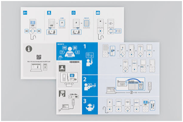 过去销售往世界各地的产品,其使用手册因为包括了我们不需要的语言,往往很容易被丢弃浪费。如今,随身听和头戴式耳机的使用指南采用图绘的方式(代替文字)更直接地描绘基本操作从而节约了资源。取消了多语种的文字产品使用手册后,图绘产品手册的使用在这些类别产品在2015年的用纸量比上一年削减了23.8%:相当于几乎16.7吨纸张。这种高效的文件制作方式还使得包装更小更轻便,有利于抑制了物流过程中二氧化碳的排放。这种非文本方法获得2015年日本优良设计奖。