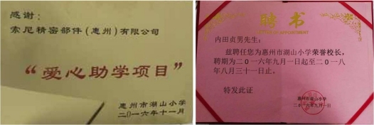 · 湖山小学的校方领导对此次活动表达了热烈的欢迎和诚挚的感谢。聘请SPDH业务企画部门内田贞男部门长为湖山小学的“荣誉校长”,并赠送SPDH“爱心助学项目”牌匾表达感谢。