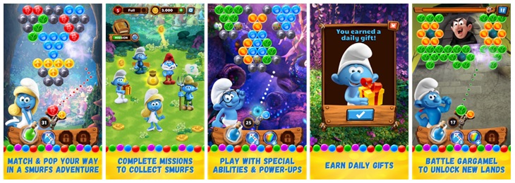索尼影视电视网络公司游戏部,出品了名为“蓝精灵泡泡故事(Smurfs Bubble Story)”的泡泡射击消除游戏。玩过泡泡龙的朋友,对于玩法应该都不陌生。不过这款游戏,充分结合了蓝精灵的故事线。玩家必须完成一系列挑战,建立自己的蓝精灵队伍,包括蓝妹妹、健健、聪聪、笨笨等。最终目标打败他们的大敌——巫师格格巫,找到失落的村庄。