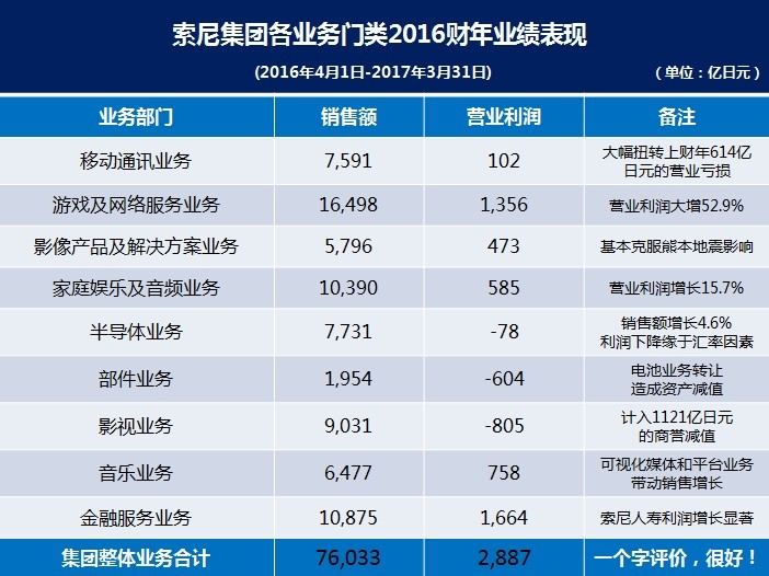 2016财年,索尼集团实现销售收入76033亿日元(678.86亿美元),比上一财年下降6.2%。这一下降主要受汇率影响。排除汇率影响,由于游戏及网络服务业务和半导体业务销售收入大幅增长,同时移动通讯业务部门销售收入有所下降,总体销售收入基本持平。