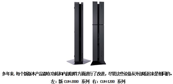 与之前的CUH-1200 系列(下图右)宽度53mm相比,新的 CUH-2000 系列缩减尺寸达到约39mm(以上测量尺寸不包括最大突起)。尺寸和重量的减少,使得PS4®更容易放置、存储和携带。此外,由于包装可以更小,也提高了航运效率。