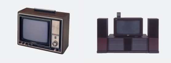 (左)1968年推出的特丽龙彩色电视 (右)1990年发布的36英寸的高清特丽珑彩色电视