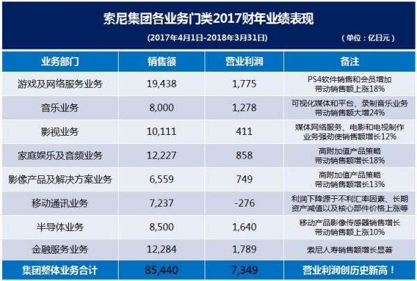 2017财年是索尼总裁兼CEO平井一夫第二个中期计划(2015财年至2017财年)的最后一年,本财年索尼公司实现营业利润7349亿日元的历史最高业绩。