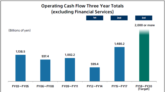 索尼最重要的目标之一是着眼于经营性现金流量(OCF),这是衡量不包括一次性收益在内的、正常业务运营收入的指标。除去金融服务业务,公司的目标是在未来三年将OCF从5000亿日元提升到20000亿日元。