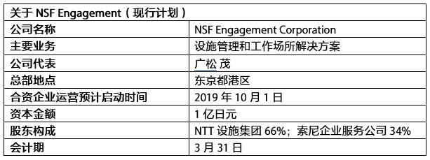 2019年3月28日——NTT设施集团(总部:东京都港区;代表董事兼总裁:一法师 淳; 下称“NTT 设施”)和索尼公司(总部:东京都港区;代表公司执行官、总裁兼首席执行官:吉田 宪一郎 ;下称“索尼”,包括其合并子公司,下称“索尼集团”)今日宣布,NTT设施和索尼的合并子公司——索尼企业服务(日本)公司(总部:东京都港区;代表董事:广松 茂;下称“索尼企业服务公司” ),已签署一项关于成立NSF Engagement公司(下称“NSF Engagement”)的最终协议,该合资公司从事设施管理和工作场所解决方案业务。NSF Engagement将继续为索尼集团提供之前由索尼企业服务公司提供的总务、设施管理和其他服务,同时还为新客户提供设施管理和工作场所解决方案服务。