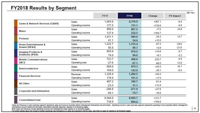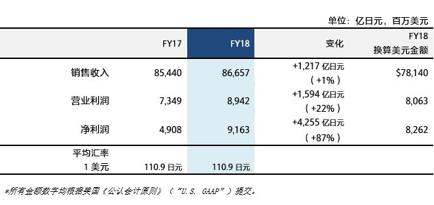 东京2019年4月26日 -- 索尼公司(下称索尼)今日公布2018财年(2018年4月1日-2019年3月31日)整体业绩数字,如下:
