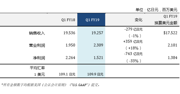 (东京,2019年7月30日 )-- 索尼公司(下称索尼)今日公布2019财年第一季度(2019年4月1日-2019年6月30日)整体业绩数字,如下: