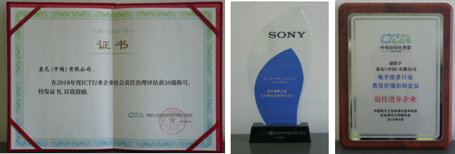 会上,索尼等25家电子信息行业企业集中发布了2019年企业社会责任报告(又称“可持续发展报告”),这是索尼中国连续发布的第14份可持续发展报告。通过“环境”、“社会”、“治理”三大篇章,阐述了2018财年索尼在华的社会责任履责实践和绩效,向利益相关方展示了索尼中国在努力提升经济价值的同时,通过业务活动创造社会价值,为环境与社会做出贡献。基于优秀的履责表现,索尼中国与其他14家行业翘楚获得“年度责任价值创新企业”荣誉;同时,索尼中国荣膺“2018年度ICT行业企业社会责任治理评估50强”称号。