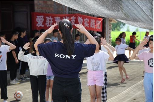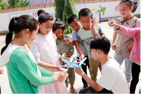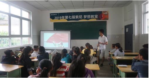 在“索尼 梦想教室”,电子科技大学志愿者为学生播放爱国教育宣传片