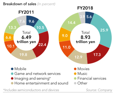 对于这家以消费娱乐闻名的企业,索尼一直对自己的业务范围持开放态度。它不仅为智能手机生产传感器,还生产高端专业相机和手术显微镜。其从事金融服务的子公司——索尼金融控股公司(Sony financial Holdings)——于1981年开始提供人寿保险,旗下还有一家运营养老院的子公司。2013年,在雷曼危机后的低谷时期,索尼金融曾一度贡献了索尼三分之二的利润。