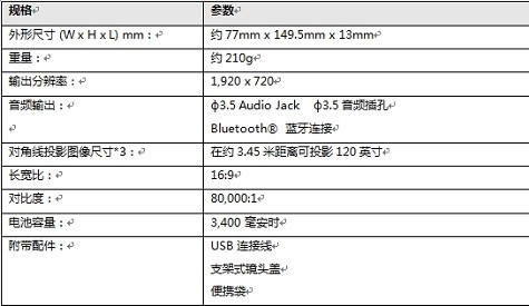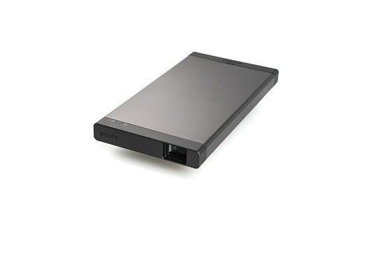 索尼MP-CL1A便携式投影仪内置3400毫安时的电池并携带USB接口,可为移动手机或平板设备进行充电。