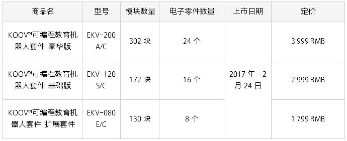 本次发布会共计推出三款套装,其中包括含有全部模块和电子元件的豪华版;精简了模块和电子元件的基础版以及用来补充模块和电子零件的扩展套件。KOOV™在模块的设计添加了大量的色彩元素,使产品更富有表现力。该套件的主体结构由拼搭模块、核心主板和传动类电机(直流电机和伺服电机)组成,为了更好的表现声光感元素,该套件中还搭配了LED、蜂鸣器、传感器(光敏、红外线、加速度、按钮开关)以及其他拼搭用的附属零件。在应用程序上,KOOV™可编程教育机器人套件支持的运行环境为Windows 7(64位)或更•••高版本、macOS 10.9或更高版本以及IOS9.0或更高版本。