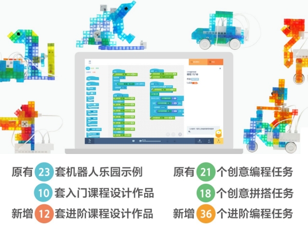 本次新推出的相关课程,相比原有课程更是增添了更多有趣好玩的内容,让孩子在学习进阶课程中快乐成长。据悉,这两个课程都分别推出了6个单元,18个任务。其中《机器人构造进阶》中的每个单元各有一个作品示例,本次在开放的单元中新增了“爬树的考拉”、“骑摩托车的兔子”等示例。让人惊喜的是,这次课程中还会有作品的实际制作与编程,用户通过课程,还可以学习实现小作品动作中需要的机械原理与编程方法,既能获得乐趣,又获得了知识。而《编程技巧进阶》中学员可以通过“海豚射门员”、“转盘游戏”等互动小游戏的制作以及较复杂程序的编写,学习如何高效得编程以及复杂算法的实现。