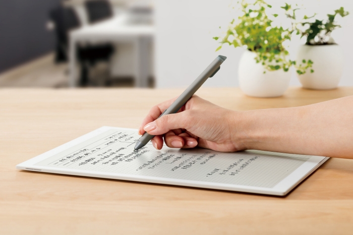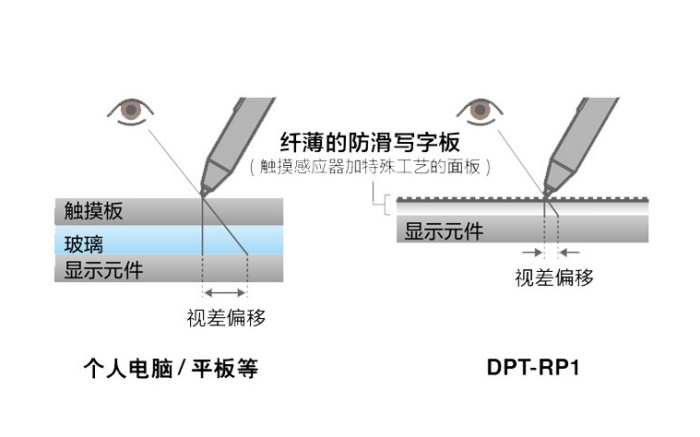 电子纸的显示屏表面,采用索尼独立开发的防滑面板,使用者在利用手写笔书写的过程中,面板可控制笔尖打滑,使其保持适当的摩擦力,实现更接近纸张书写的手感,即使在屏幕的边缘部分也可精细书写。电子纸配备的可充电手写笔拥有“铅笔型”和“圆珠笔型”两种笔芯,用户可以选择适合的笔芯进行书写。区别于个人电脑、平板电脑等设备,索尼电子纸的面板与显示 元件间的距离很小,使得书写与显示之间的视觉偏移也很小,加之运笔与显示之间的延迟很短,从而获得更真实的纸张书写效果。