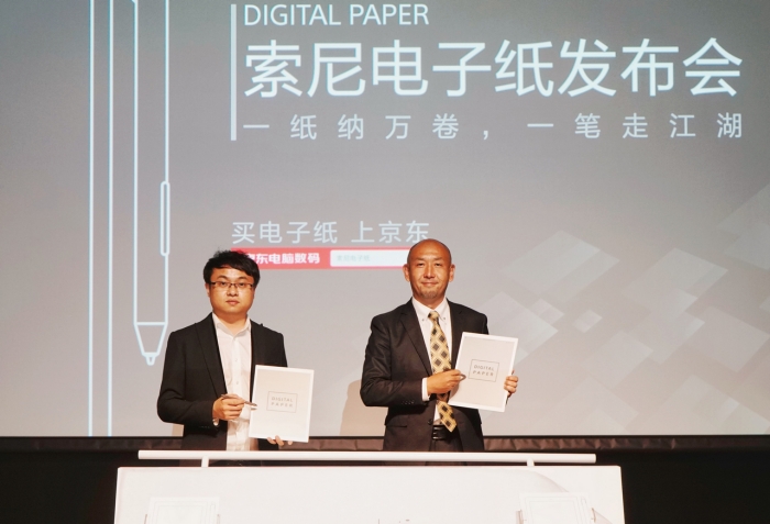 索尼中国专业系统集团总裁本野桂先生(右)、京东智能电教业务部总经理刘奂麟先生(左)共同为电子纸揭幕