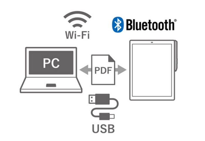 DPT-RP1电子纸具备无线通信功能(Wi-Fi/Bluetooth®),通过PC应用程序『Digital Paper App』(电子纸客户端),可实现电子纸与电脑之间的无线文件传输与管理。通过客户端的同步功能,使用者可将电子纸内的文件与PC、云存储、文件服务器等内的文件同步。而“电子纸助手”(电子纸手机客户端)也首次在全球范围内官方搭载上市,即使在没有电脑的情况下,通过它也能快速进行文件传输与共享。当然,产品还可以通过微型USB端口实现有线文件传输。