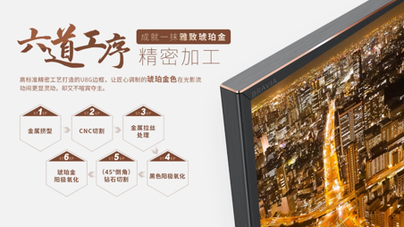 在优雅高贵的配色背后,索尼U8G液晶电视还有大气、严谨的工业设计来支撑颜值。六道精密工序——金属挤型、CNC切割、金属拉丝处理、黑色阳极氧化、钻石切割、琥珀金阳极氧化,每一项工艺技术都让琥珀金在光影流动间更加亮眼,却又不喧宾夺主,得以彰显年轻人群特立独行的审美品味。