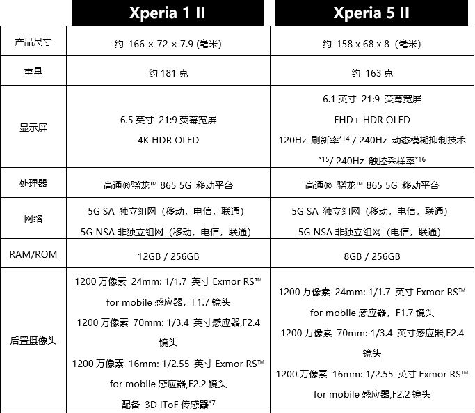 2020年10月15日,索尼中国宣布推出年度旗舰智能手机Xperia 1 II 与Xperia 5 II。两款新品秉承“为速度而生”理念,融合了索尼旗下影像、显示和音频等诸多黑科技和工业设计之美,为消费者带来摄照、影音、游戏新体验。目前两款新品已正式开启预售,并将于10月下旬(Xperia 1 II) 和11月(Xperia 5 II) 在不同渠道开始发售。