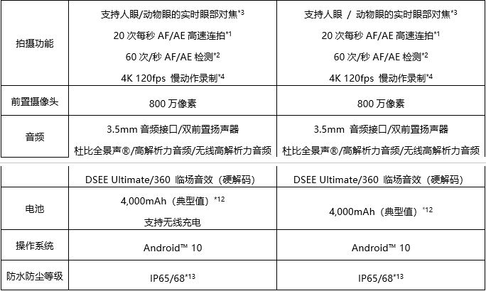 *4 Xperia 1 II 和Xperia 5 II的主相机具有4K HDR 120fps慢动作电影录制功能。根据已发布的超过14,000部智能手机的相机规格,Strategy Analytics的SpecTRAXService验证,截至2020年9月17日。
