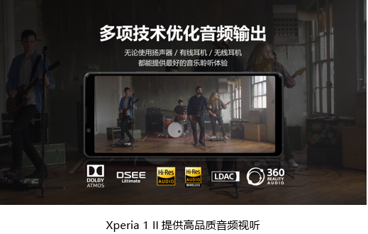 凭借索尼优秀的音响硬件及专业音乐娱乐技术,Xperia与索尼音乐娱乐公司(Sony Music Entertainment)携手将清晰悦耳的音质注入Xperia 1 II之中,带来匠心独运、忠于原声的聆听体验。此外,Xperia 1 II具备360 Reality Audio硬解码功能的智能手机。无论是使用手机的双前置立体扬声器的双正向声场,还是通过3.5mm插孔连接有线耳机或无线耳机聆听音乐,都可享受到美好的音乐体验。不仅如此,Xperia 1 II音频处理经过特别调校,可以将左右声道干扰降至20dB,比使用USB-C耳机连接低约90%以上。