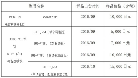 为了满足工程师的各类需求,索尼将会提供不同种类的ISDB-S3兼容产品。索尼新型调谐器模块将可用于单、双、三重硅调谐器芯片,以便能够同步记录多个频道。另外,解调器LSI将会分开销售,连同硅调谐器芯片一起安装在调谐器模块上,以促进更小巧、更轻薄的电视机和机顶盒设计。