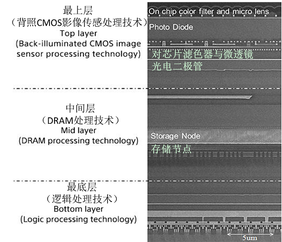 新开发的加入了DRAM层的3层堆叠式CMOS影像传感器(上图)