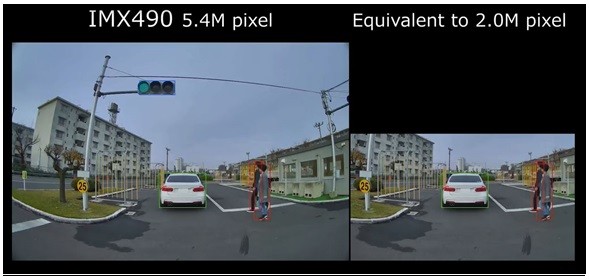 如今道路上的LED信号灯越来越多,在隧道出入口等明暗对比强烈的环境下, LED频闪减轻搭配HDR拍摄的功能对于车载摄像头来说愈发必要。该传感器在满足这一需求的同时,还具备了540万有效像素※1(2880 (横) × 1860 (竖)),视角拓宽的同时,保持了和前代产品同样的分辨率。水平方向上,除自行车和路边的行人外,该传感器可以识别更广范围内的障碍和标志。垂直方向上,在一些特定交叉路口停车时,该传感器可识别停车线上方的红绿灯。