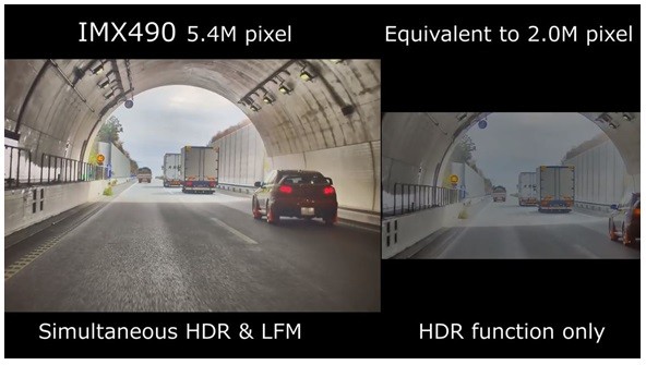 索尼还通过独有的像素结构和曝光方法提高了光饱和度。当同时启用HDR拍摄和LED频闪※2减轻功能时,可实现120dB※3的宽动态范围,大约为前代产品的三倍。即使在10万勒克斯太阳光直射下,有一辆浅色车行驶在前方时,也能有效抑制高亮过饱和。在隧道出入口等明暗对比强烈的环境中,该传感器也可精准捕捉被摄体。