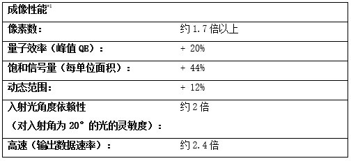 *1:使用该项技术对1.1英寸样本进行比较,比较对象为索尼1.1英寸1200万有效像素的前照式CMOS影像传感器IMX253。