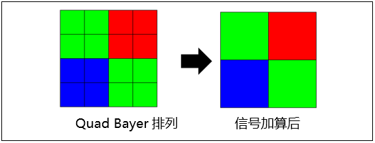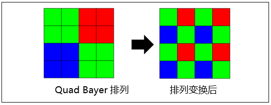 通过采用相邻4个像素使用相同颜色的Color Filter的Quad Bayer结构, 满足高分辨率和高感度的需求,且支持高动态范围(HDR)拍照。