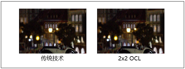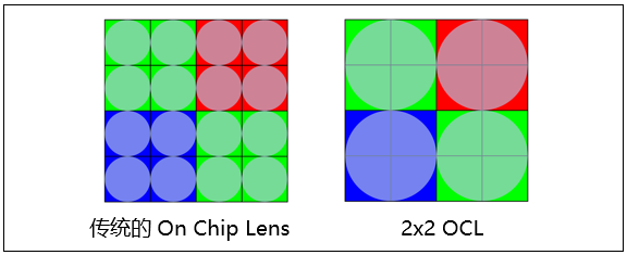 图像传感器的每个像素上,都有被称为On Chip Lens的集光镜片。传统的构造,每个像素上面都有单独的On Chip Lens. 而2x2 OCL为相邻的相同颜色的4个像素,共用同一个On Chip Lens.