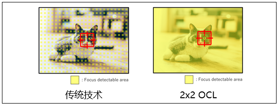 传统的使用专用像素检测相位差的方式,由于这些专用像素本身没有拍照的功能,所以仅可以将部分少量的像素用作相位差检测。而2x2 OCL的方式,拍照用的像素也可以做相位差检测,即所有像素都可以做相位差检测。因此,对于较小的被摄体都可以进行高精度的对焦。