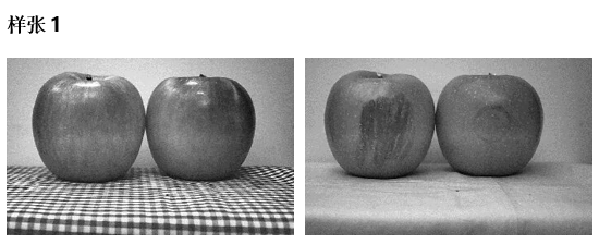 (左:可见光;右:短波红外线)切换光源以获得苹果的表皮和皮下图像信息