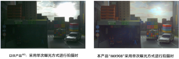 IMX908通过单次曝光方式实现高动态范围。与合成不同曝光时间多帧图像的多次曝光方式不同,本产品可以抑制伪影的产生并实现高速的图像输出。因此,拍摄动态主体时,能稳定实现高精度成像,有效抑制可能干扰AI图像识别的轮廓偏移和颜色偏差,从而提高识别精度。此外,IMX908还能输出由不同转换效率生成的多幅图像数据,为摄像头的设计提供更高的灵活性。